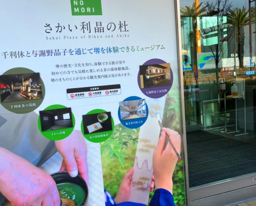 さかい利晶の社。千利休と与謝野晶子をテーマに、歴史文化を広く発信する文化観光施設よ。千利休茶の湯館、与謝野晶子記念館、茶の湯体験施設、観光案内展示室があるよ。