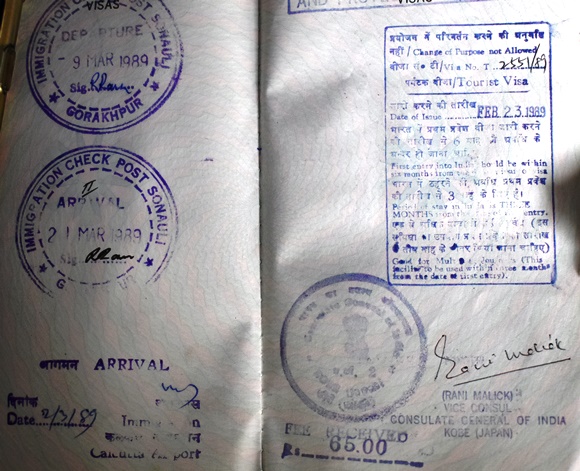 1989年インドビザ、インド神戸領事館で取得したラえらい値上げされてるな。30ルピーが65ルピーになっている。あー、ソウノリ、ゴラクプルな、ネパール国境都市やな。カルカッタに2月31日に入り、3月9日にネパールに行き、3月21日にインドに戻っている。そっからボンベイ経由で帰ったんだよなあ。