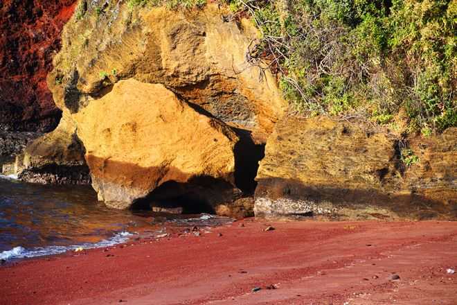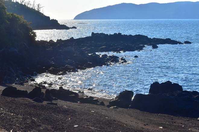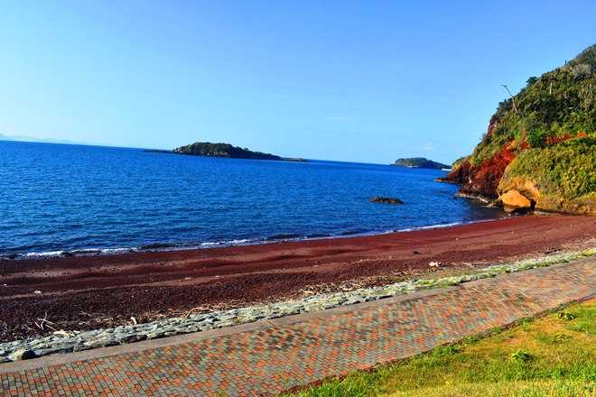 鉄分を多く含んだ火山島の浜辺、砂も砂利も赤い。
