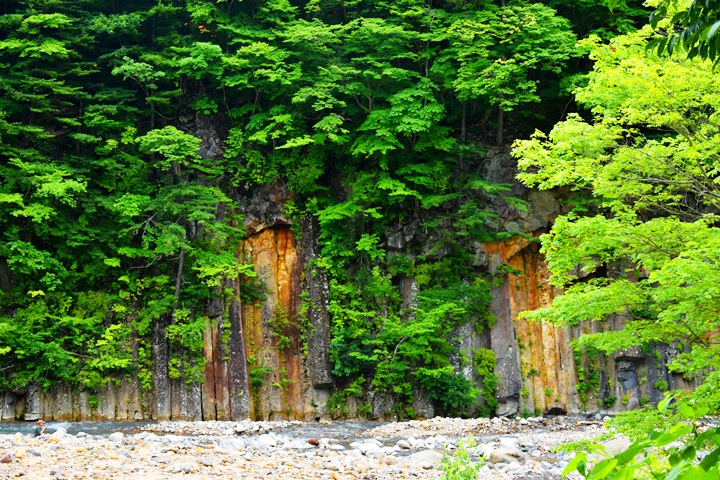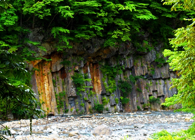 森の大橋上流右岸にある火成岩の六角柱柱状節理。