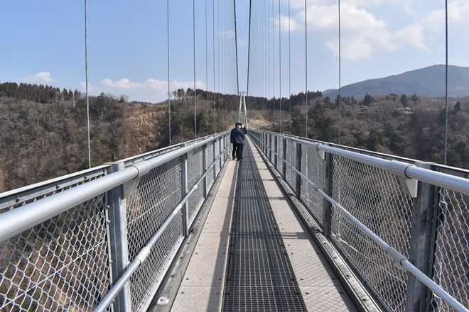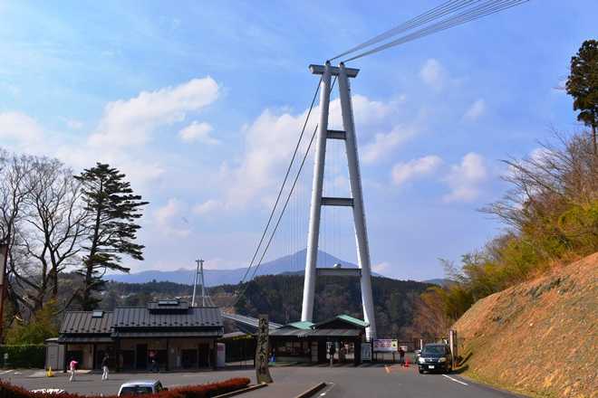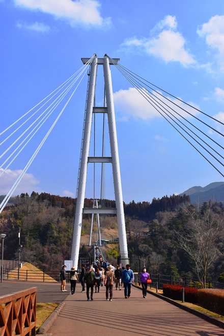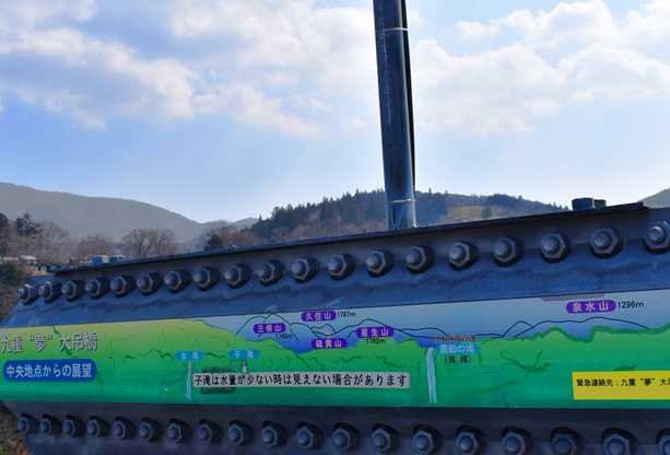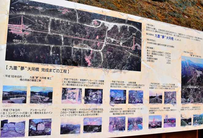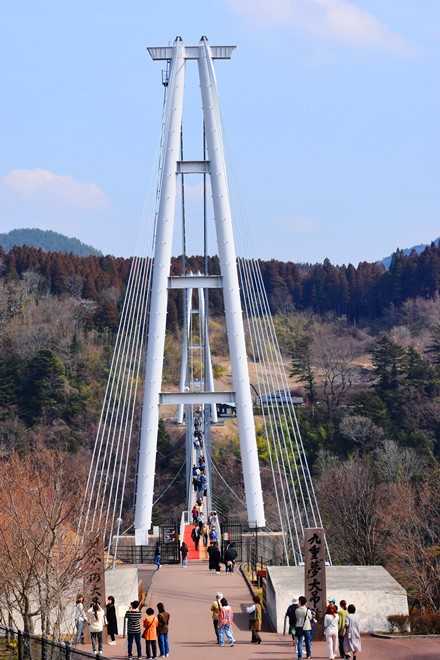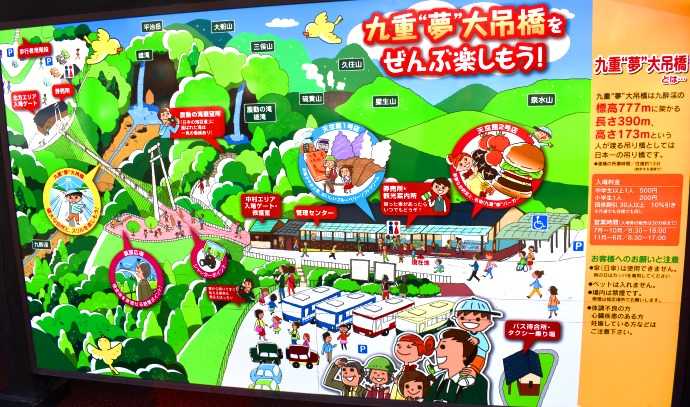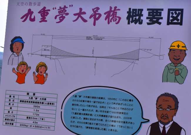 九重”夢”大吊橋は、高さ173メートル(水面より)、長さ390メートルで、歩行者専用橋としては世界一の高さと長さを誇り、2006年10月30日に開通した。幅員は1.5メートルで、大人1,800人の荷重に耐える