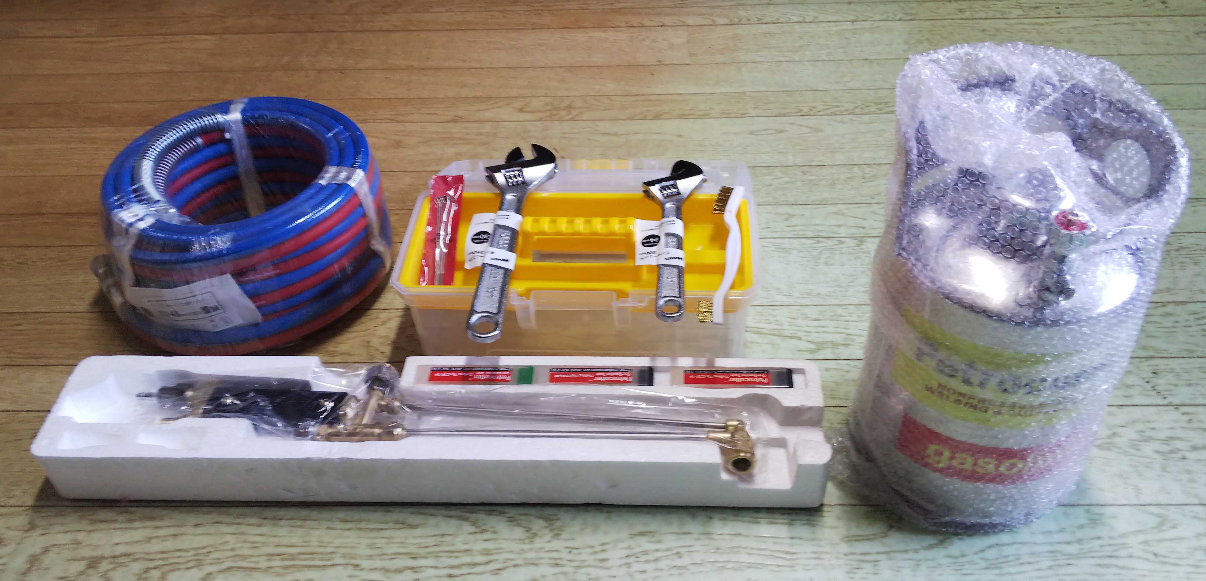 右からガソリン用タンク、工具箱、ワイヤーブラシ、モンキーレンチ2本、掃除針、ガソリンと酸素のツインホース、切断トーチ、3サイズの火口が各1本。