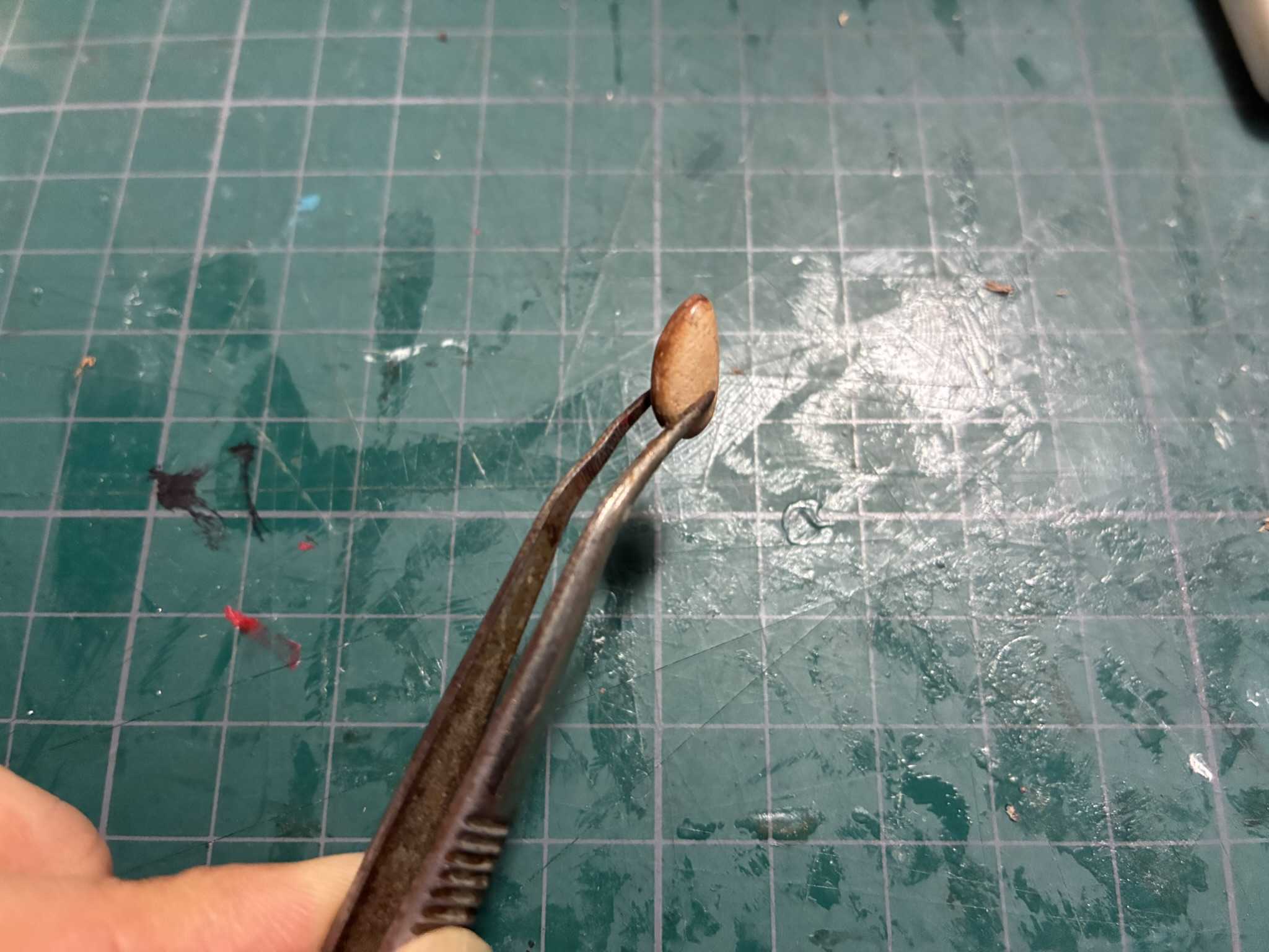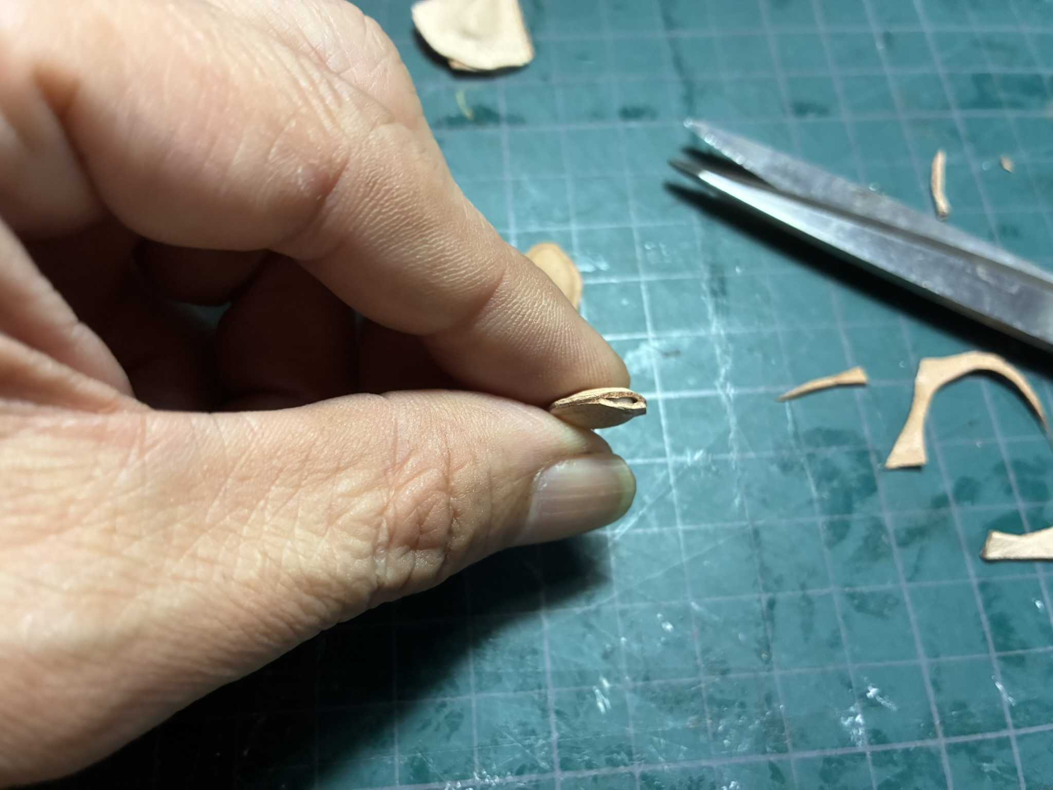 うまく切り落とせたら、周りを湿らせてからヘリ磨きで磨きます。