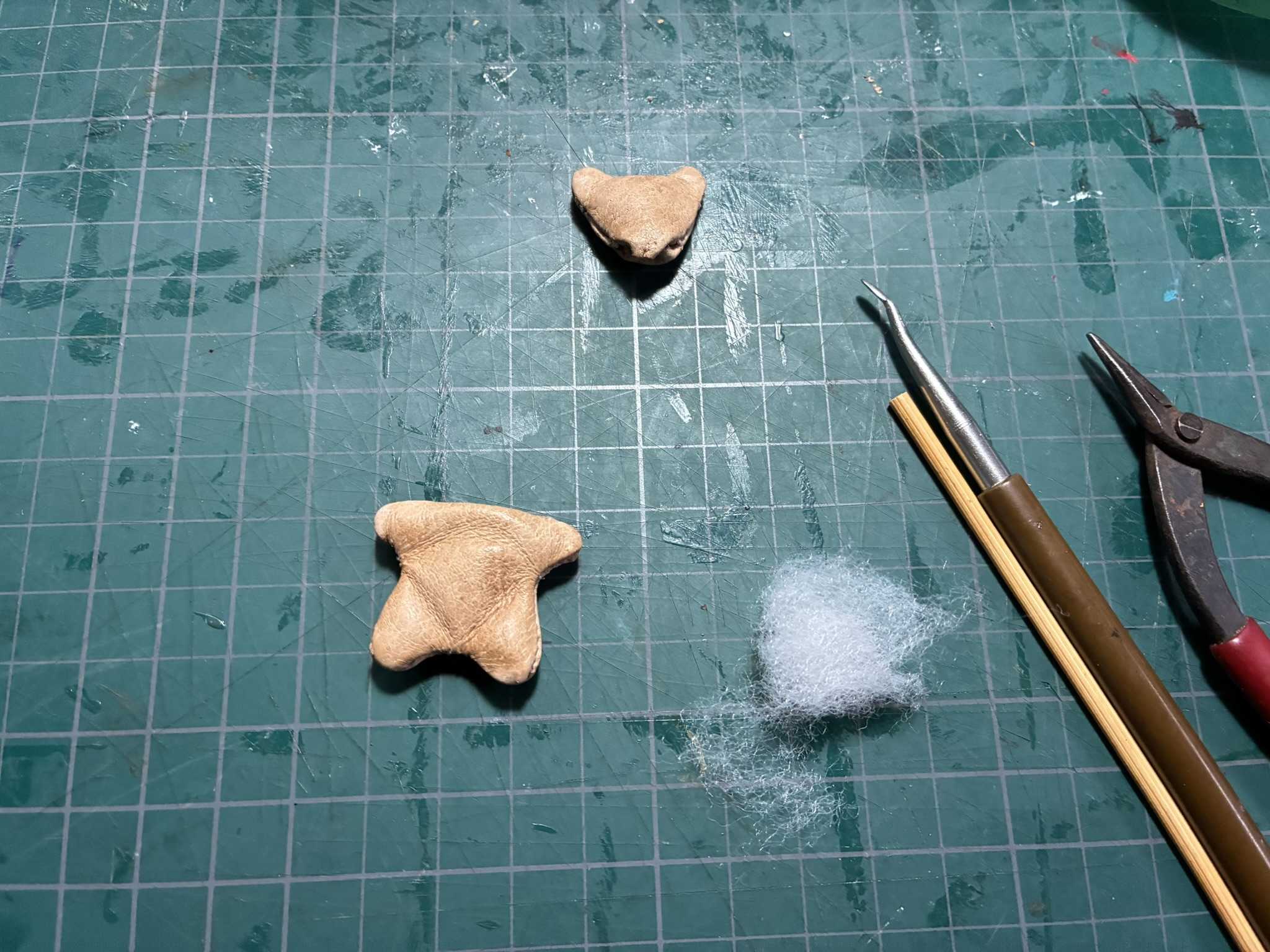 苦労して表に返しました。中には化繊綿を詰めます。化繊綿を詰めて頭と胴体を糸で繋ぎ、首のところで接着しました。革用染料で染めました。