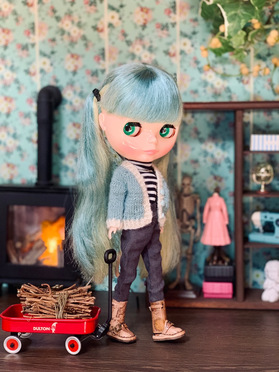 暖炉を活用しましょう!骸骨さん☠️がいるのよ。ふふ😏骸骨モチーフ嫌いでは無いです。#ネオブライスアウトフィット#ネオブライス#neoblythe#ドールアウトフィット#ドール服#ドールニット#マンディコットンキャンディ