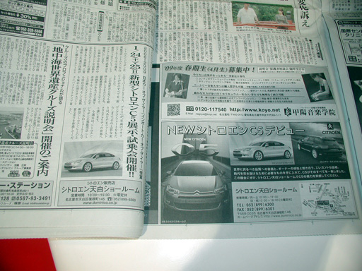 昨年10月から朝日新聞にC5の広告掲載を何度かしていますので、目にした方も多くいらしゃるのではないかと思います。広告という物はすぐに効果がでればうれしい限りですがそんなわけでもなく、じわじわと効いてきます。掲載回数と今までの販売台数のつり合いが取れているかといいますと、偏ってますねということになります。広告している →→ 車もいい →→ けどたくさん売れない!!となれば・・販売店に問題があるのか?と、考え込んでしまいそうですが、明日からの週末もC5の試乗会やってますので、いい車を見に来てくださいね。