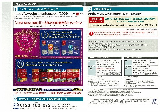 一太郎2009のDMが届きました。今どきですと、日本語入力システムにATOKを使っている人はきっと少ないと思いますがシトロエン天白では、工場も含めてすべてのパソコンにATOKと一太郎をインストールしています。(OFFICEもインストールしてますよ)しかし現実は、送られてくるファイルはすべてWORDです。そのため、社内のみでの一太郎ファイルになってますが最初に使ったのがジャストシステムだったのでATOK信者になっています。今のバージョンでも問題ありませんが新しいのが出ると・・やはり欲しくなってしまいます。2月6日が発売日です。