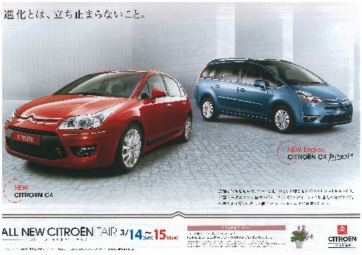 今週末の展示会は新しいC4のデビューフェアーです。けど・・まだ準備がまったくできてません。水曜日にはDMの投函をして、落ち込みチラシの折り込み地区指定をしないと間に合わなくなるので明日も出社になりますね。そうだ・・明日は「さく」にも手伝ってもらいながら展示試乗会の準備をすることに決めました。