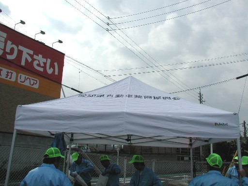 天候がすぐれませんが、マイカー無料点検の日です。滝の水にあるハローヅにて100台を目標に準備開始です。いつもだと、整備振興会の本部からと緑警察の交通課からも朝の挨拶に来ていただくのですが、今年は行事が重なり緑支部だけの運営です。雨も時々降ってくる天候でしたが、順調な滑り出しで午後2時頃には目標の100台を実施する事ができ盗難防止ねじのアピールもしながら緑支部は大活躍です。途中、シトロエンも無料点検に2台現れましたがシトロエン天白からもメカニックが参加しておりいつものように点検をすることができ、輸入車への対応も完璧でした。仮にトラックが来ても、大型トラックの専門家が7名もいたので問題ありませんが、さすがそれはなく乗用車のみでした。今回の100台の中で、プリウスの点検がいちばん難しかったようです。なぜかといえば・・停車中にエンジン始動がうまくいかないためです。