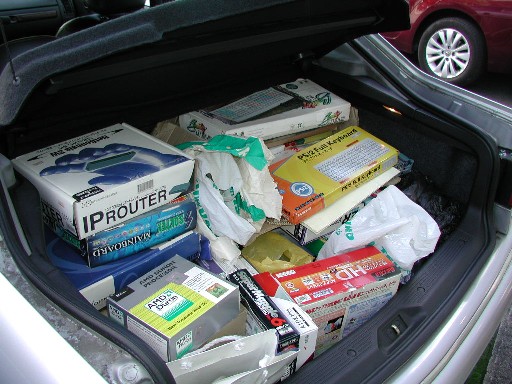 長期在庫になっていたエグザンティアの販売先が決まりトランク内に保管していたパソコングッズを移動する日が来ました。10年ぐらい前からの部品が外してため込んでありますので現在では数値が低くて使い物にならないカードとかCD-ROMドライブ フロッピーディスクドライブ 一太郎8スカジーケーブル RS232Cケーブル カテゴリー4LANケーブル等なつかしい物ばかりです。捨てるわけにもいかないので次の長期在庫になりつつある車のトランクにそのまま移動です。