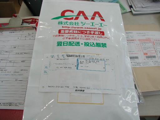 オークション会場で仕入れた車の登録書類が宅急便で届いたのですが、どうしたことやら?違うオークション会場の名前が大きく書いてある入れ物です。そんなことあるはずが・・・と思いながら確認すると送り状は「どみにこ」ですが、荷物の宛先は違う名前です。住所は近いですが、違う自動車さん(たぶんそうだと思います)の名前が書いてあるのです。きっと大事な書類なんでしょうが、入れ替わってしまっては役立たずです。飛脚のマークの会社へ電話して「違うよ」と言ったら15分後には、先ほどの配達ドライバーが走りながら現れて荷物の差し替えです。よく見れば、いつもドライバーと違っていたので・・・・間違えたのかな?
