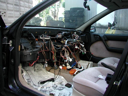 いつ見てもぞっとする光景のヒーターコア交換の途中です。ダッシュパネルを脱着しなくてもいい位置に変更してくれれば楽なんですが、構造上無理なのでばらばらにして作業するのみです。スピードメーターケーブルついでに交換しようとしたら、準備してあったケーブルの長さが違うとかで一時中断になってしまいました。早く元通りにしないと戻す順番を忘れてしまわないと心配するのは見ている「さく」だけなのでご安心下さい。