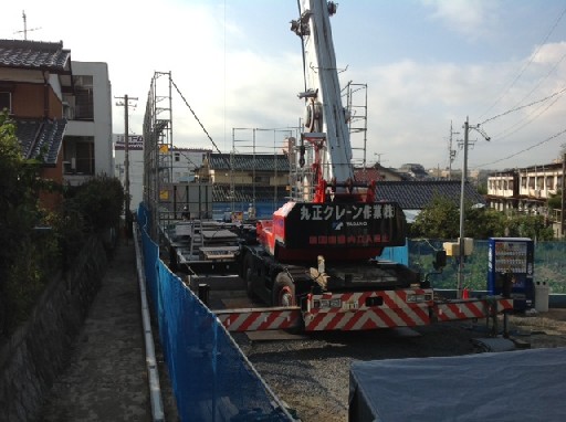 朝きっと8時から作業をしているのでしょうは8時半の時点でアームは空に向かって伸びきってました。いよいよ鉄骨が建つんだなと思いながら、ちらちら見てました。夕方薄暗くなりかけた頃、大きな声がたくさん聞こえてくるので何事かと裏を覗くと、シトロエン名古屋天白の積載車のすぐ上にアームが伸びてきて、脚立を持ってきて押さえています。ちょっとぐらつくと当たりそうですね。けど、人間の力で押さえることができるのかなと思い見てると押さえながら、アームを少しずつ縮めています。狭い場所だけに大変そうです。今日の公式ページは「DS3 はWRC 2 2013年の世界チャンピオンになりました!」です。
