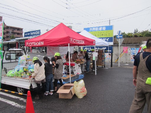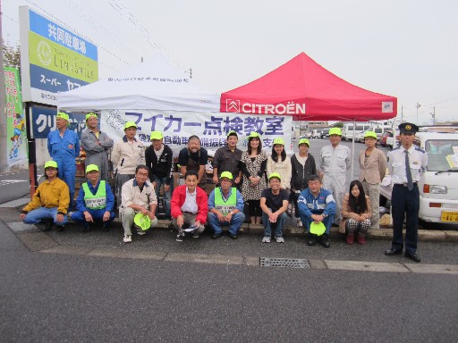 マイカー無料点検の続きです。朝の準備は続きます。今年から場所を変更したこともありいつもより準備に時間がかかっています。点検開始の10時近くなってきました。さあ、朝礼をして目標台数の100台を目ざします。緑警察署生活安全課の警部補からも自動車盗難の話しがあり開始まであと5分です。そして開始する前に全員で写真撮影です。もちろん緑警察署の方も含めて・・・1名は写真撮影していたのでこの写真の中にはいませんでした。警察の方は制服ですが腰の短銃はなしです。10時です。マイカー無料点検の開始です。整備振興会の支部会員であるプロの整備士が点検をしてアドバイスもして、盗難防止用にナンバーのねじまで交換して、点検グッズとタオルと秋のくだものと落花生とディズニーグッズのくじまでひける・・すばらしいイベントなんです。本当にタダなの?と聞かれる方もいましたが本当にタダなのです。テントでは100台分のおみやげ作りに精を出しています。朝ご飯食べてない方はお茶とパンもあり、3人ほど食べながらです。この紙袋にグッズと果物を入れて渡します。1番から100番までの数字を記入して、あと何台ということがすぐにわかるようにしています。くじ引きの内容は知らないキャラクターでしたがけっこう人気があるのか?マイク?とか呼んでました。モンスターインクという名前のディズニーキャラクターですがひとつ目小僧風に見えるのです。昨年も多かったでしょうが、今年はとにかくハイブリット車の多いこと。こんなにハイブリットばかりになると工場に入庫してくる車が少なくなると嘆く支部会員さんもいました。(そんなこと言わずに、新しい車の勉強しましょね!)落花生のすくい取りも大変順調で、みなさん喜んでいただけてます。どんどんすくって、減っていくのですぐに補充です。このスコップですくうのです。だいたい上手にすくって約850グラムという目論見らしいです。けど、子供だと最後に少し手ですくって入れてあげたりしてとても楽しい場となっています。雨も完全に上がった事を確認して、いよいよ「てんけんくん」の登場です。緑支部初の企画でして、誰がかぶるのかなかなか決まりませんでしたがいちばん若手となりました。中はとても暑くてふらふらになるそうです。かつ、前方の視界がかなり狭いらしいです。これから「てんけんくん」が点検車を呼び込みにかかります。続きはマイカー無料点検その3へ・・・・・今日の公式ページ「2台のDS3カブリオ」です。