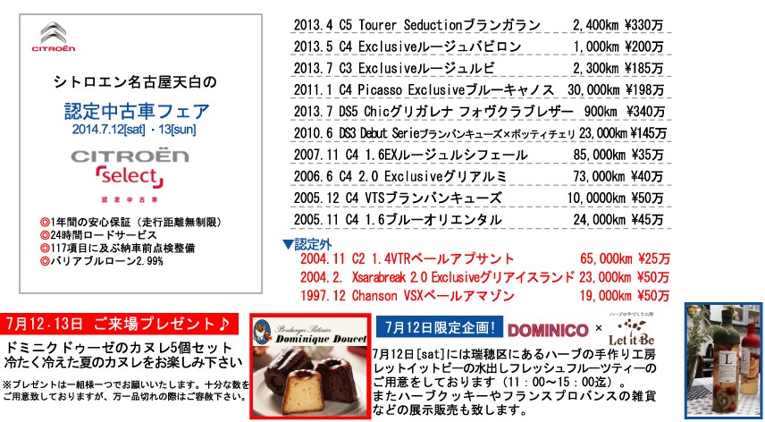 7月12日&13日はシトロエン名古屋天白の下取りしたシトロエン中古車のフェアーを開催します。まだ準備中ですが、すごく良い内容にするためにいろいろなことしますよ。来週には内容を発表します。エージェンシーにお願いせずに、自力イベントなので手作り感いっぱいの「どみにこ」らしい内容にご期待下さい。すでに車を購入した方も2台目に、またご紹介もお願いします。全部ではありませんが、認定中古車にして保証付きで販売します。今日の公式ページは「頑張ってフランス!」です。