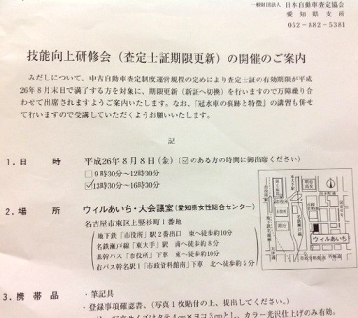 もう少し気づくのが遅かったら、査定士の更新研修を忘れるとこでした。本日、思い出したのでまだ間に合います。けど、危なかったです。この研修を受けないとどうなるのかはわかりませんがあまり良くないことには間違いないでしょう。日時は8月8日なのでセーフです。今日の「さく」さんはいつもどおりで落ち着いてます。このままの状態を保ってね!!今日の公式ページは「マックスバリューの横」です。