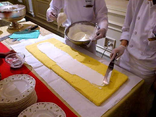 昨晩は食事をしながら、ロールケーキが出来上がる過程を見ることができました。実際にあんな長いスポンジを使うのかどうかを聞くのを忘れましたが中に「すいか」を入れない?と聞きましたが・・「No」でした。あんなにたくさんの生クリームを塗って、端から巻き上げていきます。途中でスポンジが割れないのは柔らかいからでしょうか?時間をかけて慎重に巻き上げていきます。1人ではきっと無理なので2人で作成します。巻き上がった後は、粉砂糖をかけてカットです。これで完成です。もちろん、食べました。おいしかったですよ。今日の公式ページは「名古屋から1時間の場所」です。