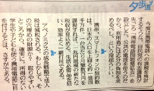 中日新聞の夕刊に出てました。携帯電話への課税について・・・少し前のニュースで課税を検討中と見ましたが日本の人口を上まる1億4千万台に数百円ずつ課税すれば1兆円の新たな税収が見込めるということですが法人税の減税分を穴埋めするために取りやすいところから確実に。最後のこの言葉がすごい? すばらしい?「所得のない学生や子供も使う携帯電話に目を付けるとは、さすがである。」誰でも持っている携帯電話なんだから!今日の公式ページは「美しいDS3」と「キャンペーンのお知らせ」です。雨が降ってるのはすごいでしょ!!