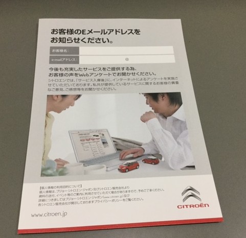 シトロエン名古屋天白では、サービス入庫いただいたお客様へのアンケートをWebに変更します。ので、お引き渡し時にメールアドレスをお知らせくださいとお願いをします。そのメールアドレスが携帯ではない物をとなってるのがちょっと理解しづらいですが・・・・今どき、携帯でパソコンと同じ事ができるはずなのでいいじゃないかと思えるのですが、受信設定の問題でしょうか?