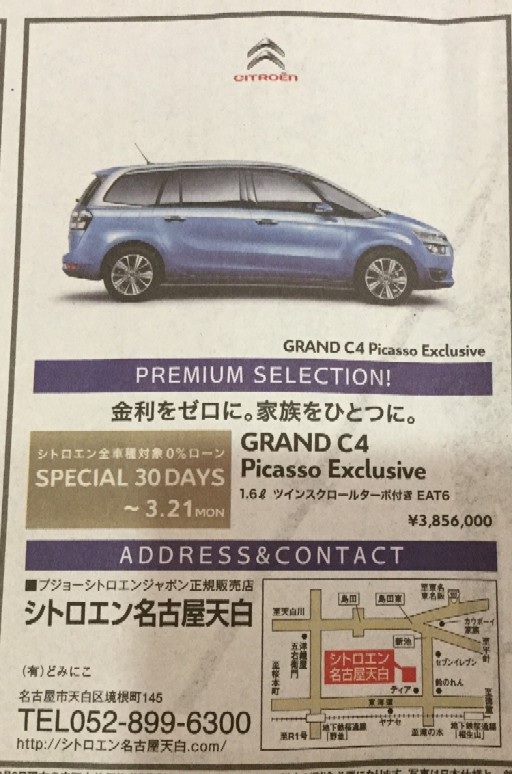 今朝の朝日新聞朝刊にシトロエン名古屋天白の広告を掲載しました。0パーセント金利も今月21日までです。今月登録という条件もありますので、お早めに商談しましょう。絶対にお得です。