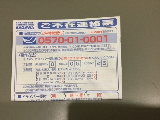佐川急便の不在連絡票がシトロエン名古屋天白の本社に入ってました。普通であれば、本社の住所でも全部ショールームに配達してくれるはずですがドライバーが違ったのか・・・残念。気づいたときにはドライバーの携帯にはすでに繋がらない時間帯になってました。住所を直しておかないと、まずいのかな??今までは大丈夫だったのだけど?