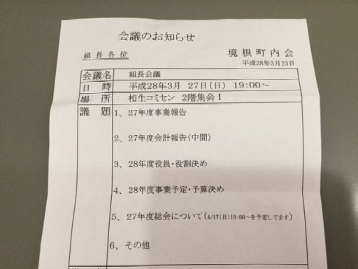8年に1回、役が回ってくる町内会の組長に4月からなりますと連絡がありました。住んでないけど、会社があるんだからやらなければと・・・・ということより、明日の夜は組長会議へ行って来ます。町内会の会長ではないので、そんなに仕事があると思えないし近所つきあいも大切なので。ただ、家に帰る時間が遅くなるのが気になりますがしかたがないです。