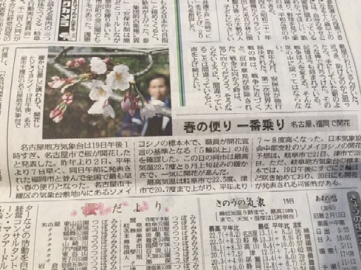名古屋で桜が開花です。と新聞に出ています。福岡と並んで一番乗りとか。来週ぐらいから山崎側のライトアップが始まりきれいな夜桜が楽しめます。どこかでは見に行かなくては!!