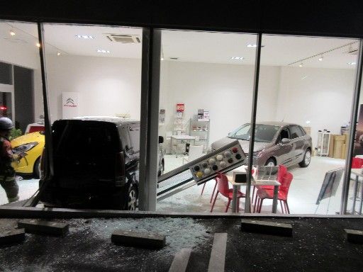 昨夜の大事件とは、本当に大事件です。夜9時に子供の塾が終わり、帰りますよというメールが届きさあ、晩ご飯を完成させなければと思いながら準備していると、たぶん9時半前ぐらいに帰宅です。すると「ショールームのあたりから車が転げるような音がした」と言うのです。転げる音とはどんな音なのかわかりにくいですが普通ではない音だったというのです。(今?の自宅はショールームからすぐの場所です)その音を聞いた場所はショールームから坂を30メートルぐらい上がった場所で・・・たぶん、振り返ったのでしょうが、異変には気づかない角度でしょう。その後、絶対に見に行った方がいいと言うので半袖シャツにサンダルで2人で見に行きました。いつも交通事故がある場所があるので、そこでぶつかった車がいるなと思いながら、通りますが何もなし。道路も南に向かってじっと見ますが何もなし。何だったんだろうねとショールームの駐車場に入れようとした瞬間、2台展示のショールームにもう1台車が増えてます。えー・・車がガラスを破って突っ込んでるのです。近所の人も集まってきてます。なぜ??と言いたいですが。かなりのスピードでジャンプしながらダイブです。奥には介護され犬となった「さく」がいます。ショック死してないか、血の気が引きます。サンダルのため、ショールームの中をうまく歩くことができなくしかも、商談テーブルや椅子が10メートルぐらい吹っ飛んでます。足、ケガしようが「さく」のところへ思い行くと大丈夫でしたが、すごく怖かったのは間違いなし。その時、突っ込んだ車の中にはまだ人がいること判明。(いなくなることはないので、当然ですが)が、その時には救急車も来て運ばれていきました。さぁここからが大変。今からどうするか?弟と工場のTさんに電話して、「すぐ来てくれ」と。まずは、この軽自動車を外に出さなくてはと思いレッカー業者と無くなったガラスの代わりに何かしなくてはと、いつもの建築設計のMさんに電話です。軽自動車がレッカーに積まれてから、どう片づけるか?ガラスのほうきで集めて袋に入れるのですが無茶苦茶重いです。強化耐熱ガラスなので、よけい重いかもしれません。そんなことやってると、すでに時刻は1時過ぎ・・子供の学校もあるし、まだいまからご飯も食べないといけないので今日はここまで、力尽きです。破れた場所はブルーシートで目張りみたいにしてあっぱーぱあー状態ですが、これで良しと。続きは明日また。