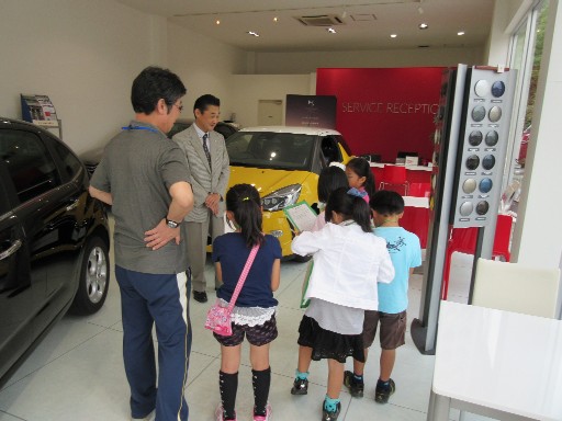 毎年、相生小学校の子供がシトロエン名古屋天白のショールームを訪ねてくる時期です。今日はちょうど。その日です。今年度から、私が子供たちからのインタビューを受けます。すごく難しい質問がきたらどうしようかと思いましたが大丈夫でした。ちょうど、同時間帯に3組の来店があり普段の仕事ぶりも見てもらうことができました。最後に記念撮影してお別れです。