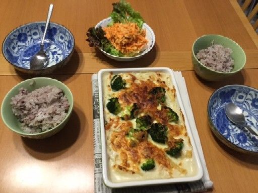 このところ、買ってきた物を並べて食べる晩ご飯でしたが今日は時間に余裕があったので作りました。ニンジンサラダとマカロニグラタンです。1時間以上かかりましたが、ツナ缶を混ぜたサラダもいい出来具合と思いましたが、野菜嫌いの子は食べません。残念・・・見えないように細かく粉砕するしかないなと思いながら次の攻略?を考えます。アイロンがけも修了したところで、眠くなってきたので本日はこれにて修了です。