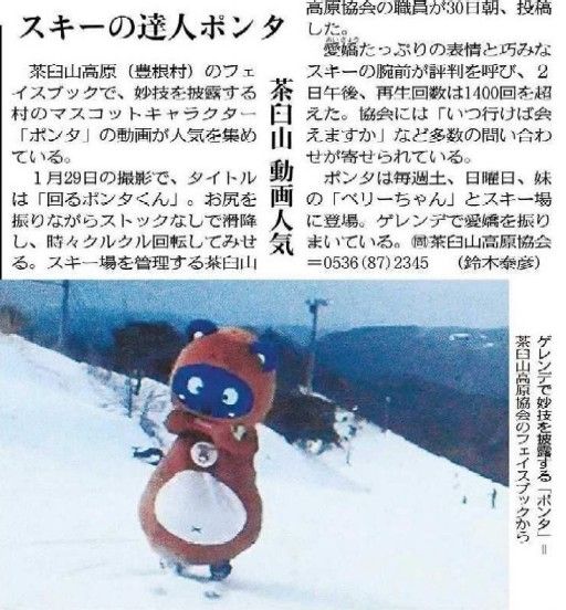 中日新聞にこんな記事が・・・ポンタがスキーの達人となり茶臼山スキー場に出没です。見に行きたいけど、平日はきっといないだろうな?最後にスキーしてからすでに7年ぐらい経ってる気がします。雪山に急に行きたくなりました。