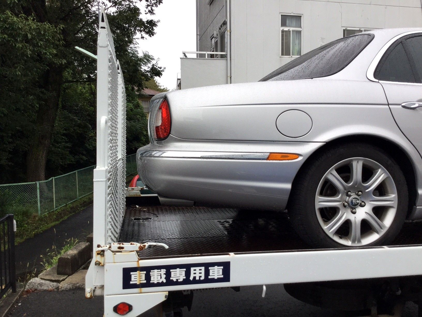 フロントのオーバーハングが少なくリヤのオーバーハングが大きいこのクルマはロングホイルベースのため、積載車に積み込むと後ろのすき間はこれだけしかありません。でも積み込めたのでOKです。フロントタイヤの輪留めの位置を前にずらすことがだいぶ出来るので、もっと長いクルマも積めます。が、そんなことはそうないでしょう?