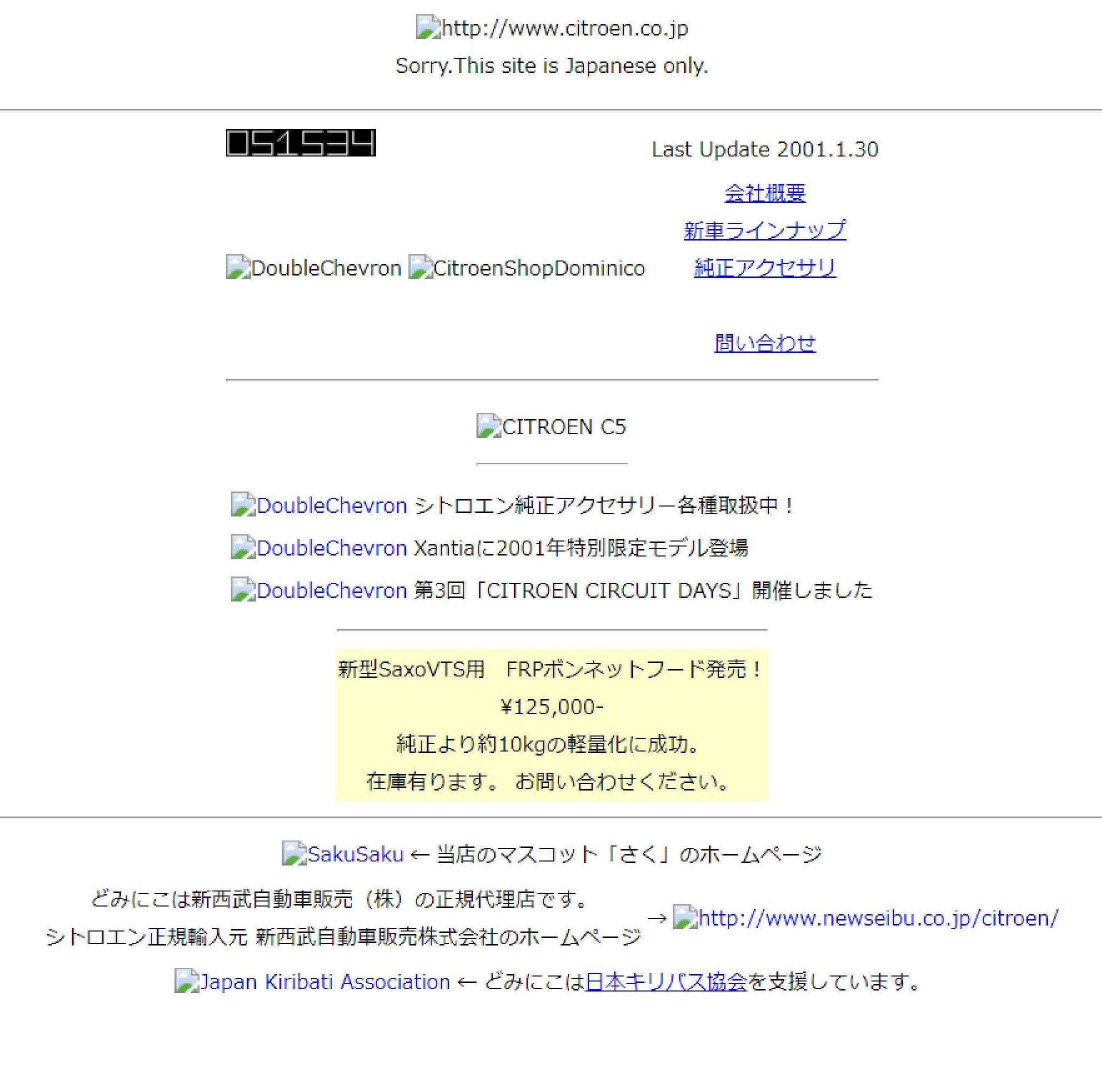現在、シトロエン名古屋天白のホームページを大きく変更のため、作り直しています。どんなデザインになるかはまだよくわかりませんが更新が簡単にできるようにするので、自分自身で楽しみです。dominico-shopとうまく、くっつけることができればと思ってます。弊社のホームページの歴史は長いのですよ。最初にドメインを取得したのは。1997年の夏です。すでに21年前です。その当時のホームページを見ることはできませんでしたが2001年当時のは出てきました。(画像は表示せずでした)「さく」だ! 「キリバス」だ!なつかしい物ばかりです。ここでひとつ? 自慢話になりますがこのホームページのURLを見ていただけます。citoroen.co.jp です。すごいでしょ?当時の輸入元の新西武自動車よりはやくホームページを立ち上げたのです。今はこのURLを譲渡してますけどね。(citroen.jpも同じく)新しいホームページは来月以降の完成となりますが今以上に個性を強く出します。