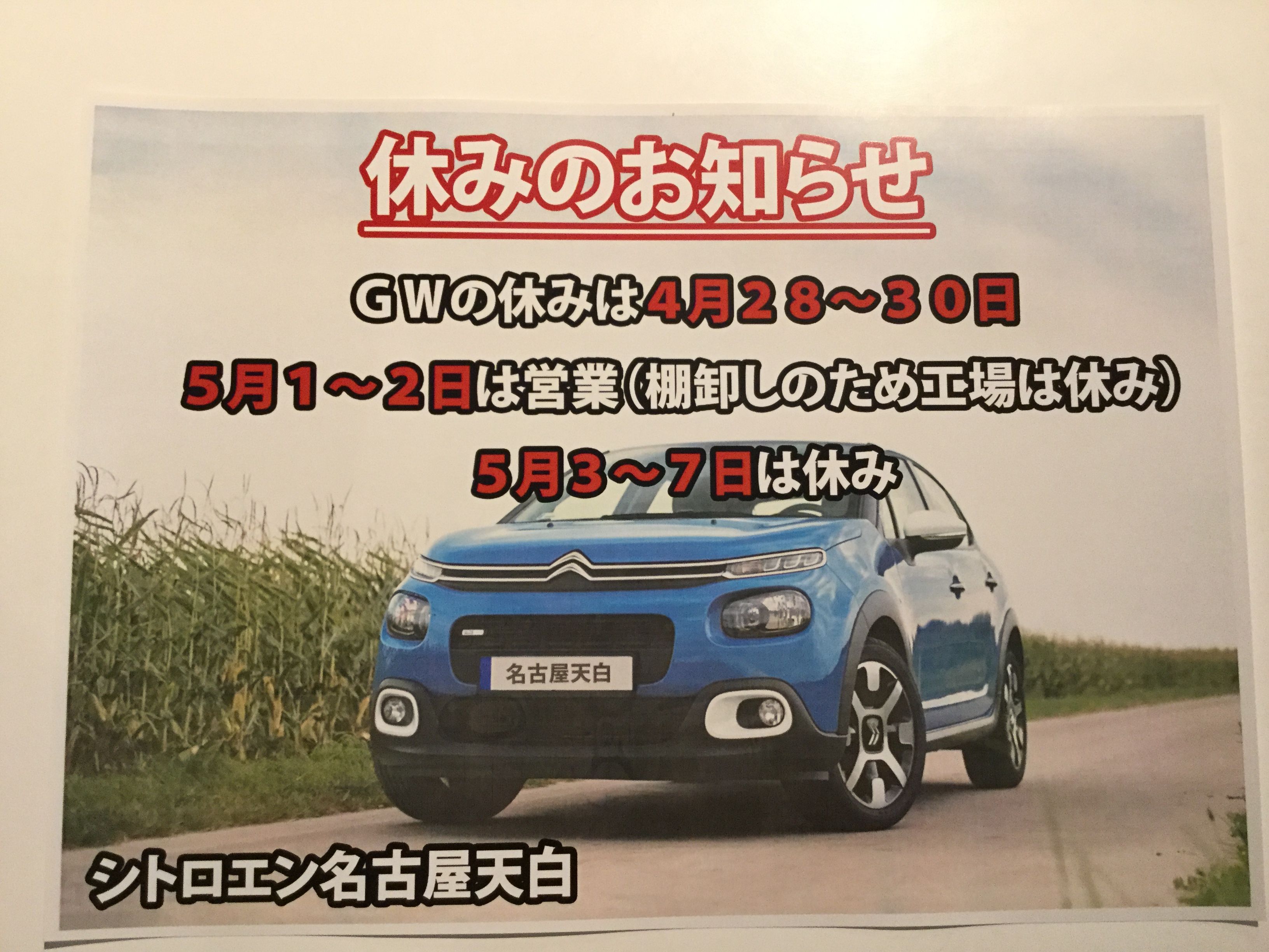 シトロエン名古屋天白の大型連休は下記のように休みます。ちょっと長い気もしますが、輸入元も休みですし部品供給も止まります。そのため、思いきって長い休みにしました。休み明けの5月8日はどんな事が起きてるかちょっと恐い気もしてます。