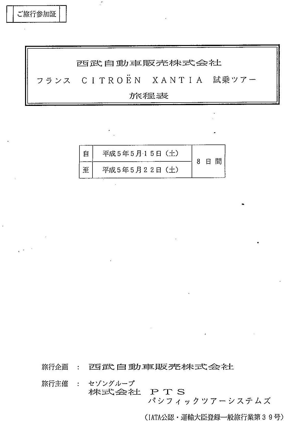 長くきちんと?保管しすぎました。事務所の片づけを少し前から続けてますがまったく終わりません。けど、片づけている最中に、すごく懐かしい写真やらパリ旅行の資料が出てきたりするので・・・・そんな時は手が止まります。本日、見つけた??書類(旅程表でしたが)にはなんと、その時は違う会社に勤めていた弊社サービス工場のT氏と私の名前がありました。1993年時には、いっしょに仕事するなんてお互いに思わなかったでしょうね。シトロエンの本社で、スペシャルなランチ後に本社内の小さなテストコースでXantia(すべて左ハンドルでした)の試乗をしたのでした。当然、ランチにはワインがたっぷり出てきたのでいつも調子で飲んで試乗でしたので、小さなテストコースからコースアウトしそうなスピードで前輪が流れないようにアクセルを強く踏んでたはずです。翌日はレンヌ工場まで行き、本当?の試乗でした。この試乗会はおそらくヨーロッパ各国から参加だったためすごい人数だったのと、日本人は全部で11名だったのでなんか順番待ちしてても、勢いがある国の参加者が勝手に前の方へ行き、すごく待たされたのです。でも楽しいパリツアーでした。