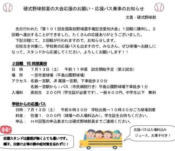 今週土曜日の高校野球の愛知県予選の2回戦も相手は私学となりました。応援バスなんてのが、毎年出るのか知りませんが一宮球場に向けての在校生、保護者用のバスです。学校出発ですが、この日はもっと早い時間帯から学校出発の違う目的地に向けてのバスに乗ります。きっと道中で野球の話しがいっぱいでると思います。そしてこの日の夜には食事をしながら誰々のファインプレー、良かったねと話せたらと思ってます。