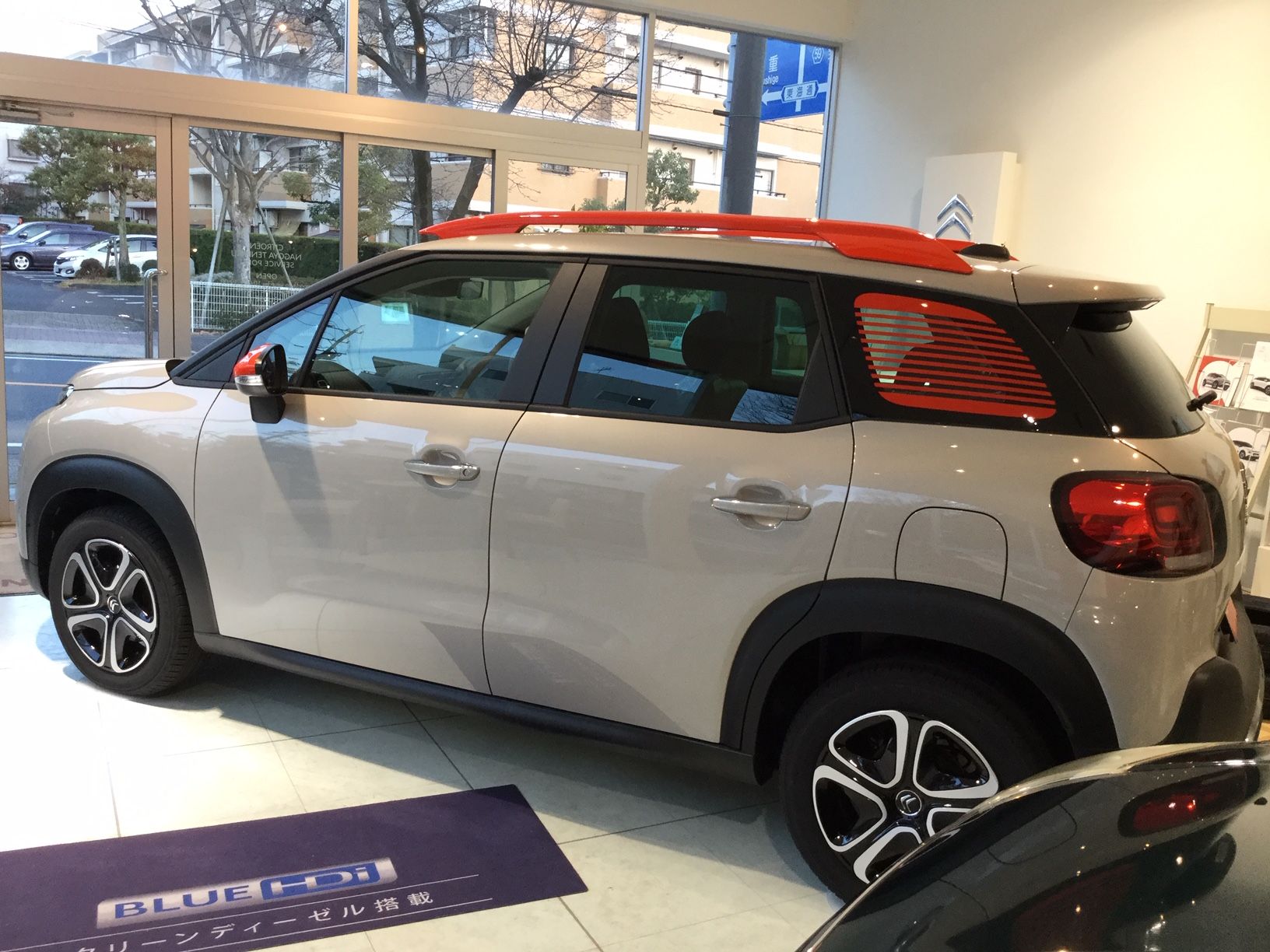 今日からの展示車はC3 AIRCROSSです。グレードはFEELの方です。サーブルのボディカラーにオレンジのルーフレールがとても似合います。シトロエンらしい組み合わせです。2月3月は良い条件も出せます。普通のC3もいいですが、エアクロスも良しですよ。
