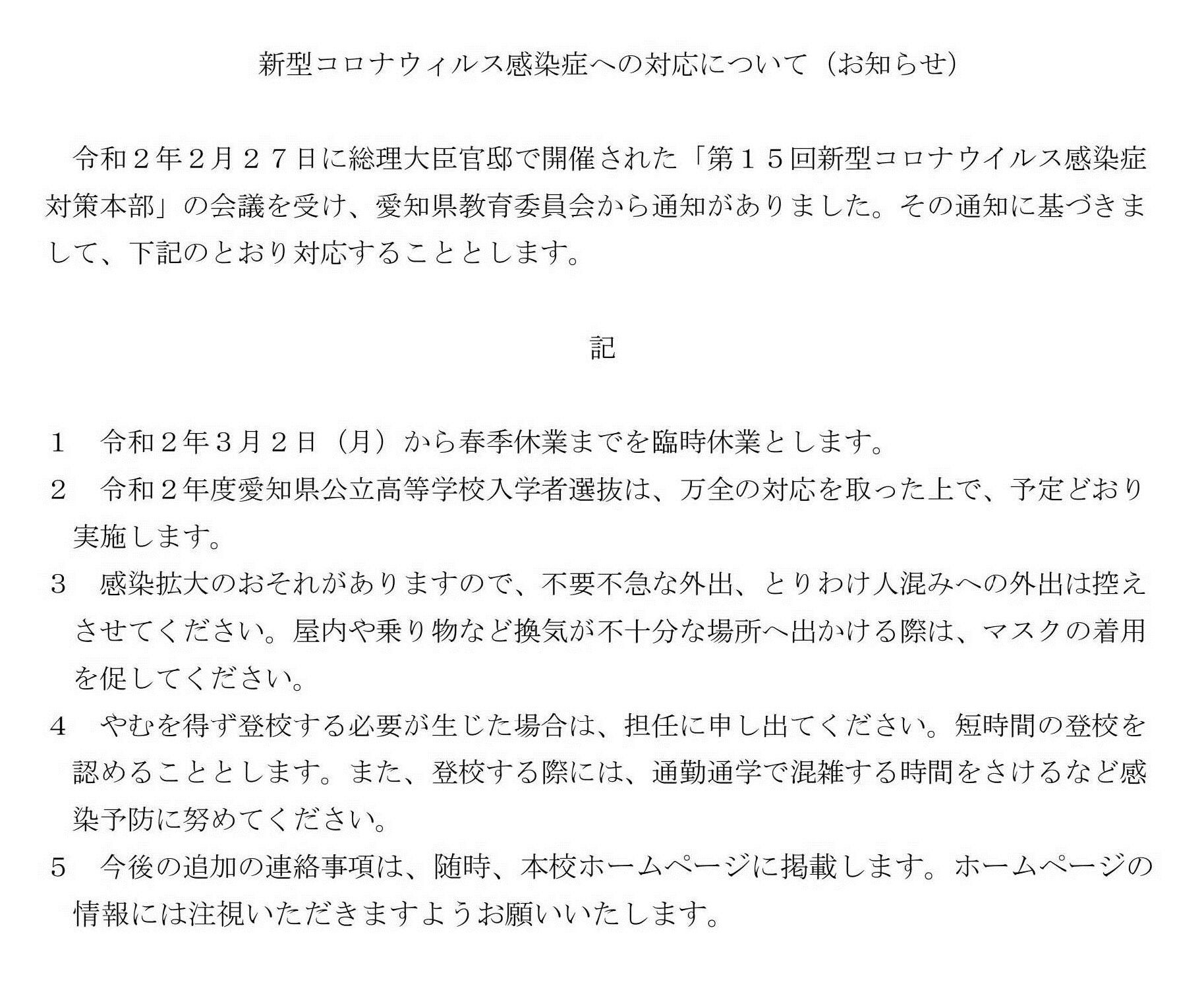 政府の発表によれば3月2日から終業式までお休みにしないさいと言ってます。ということは、3月いっぱいは休みで、次は始業式になるということでしょうか?愛知県はその通りにするのか、独自に行くのか?卒業式が明日なので、そこだけは間に合いますね。