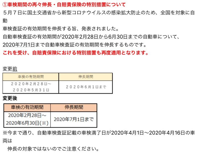 今月も自粛が続いてますが。車検期日がまた伸びました。確かに陸運支局が混み合うのはわかりますが何か違う感じがします。気をつけないといけないのは、4月1日から16日までの間に満了日が来るクルマは伸びないということです。間違えてると大変です・すでに期日から経過してますので、大丈夫だとは思いますが。