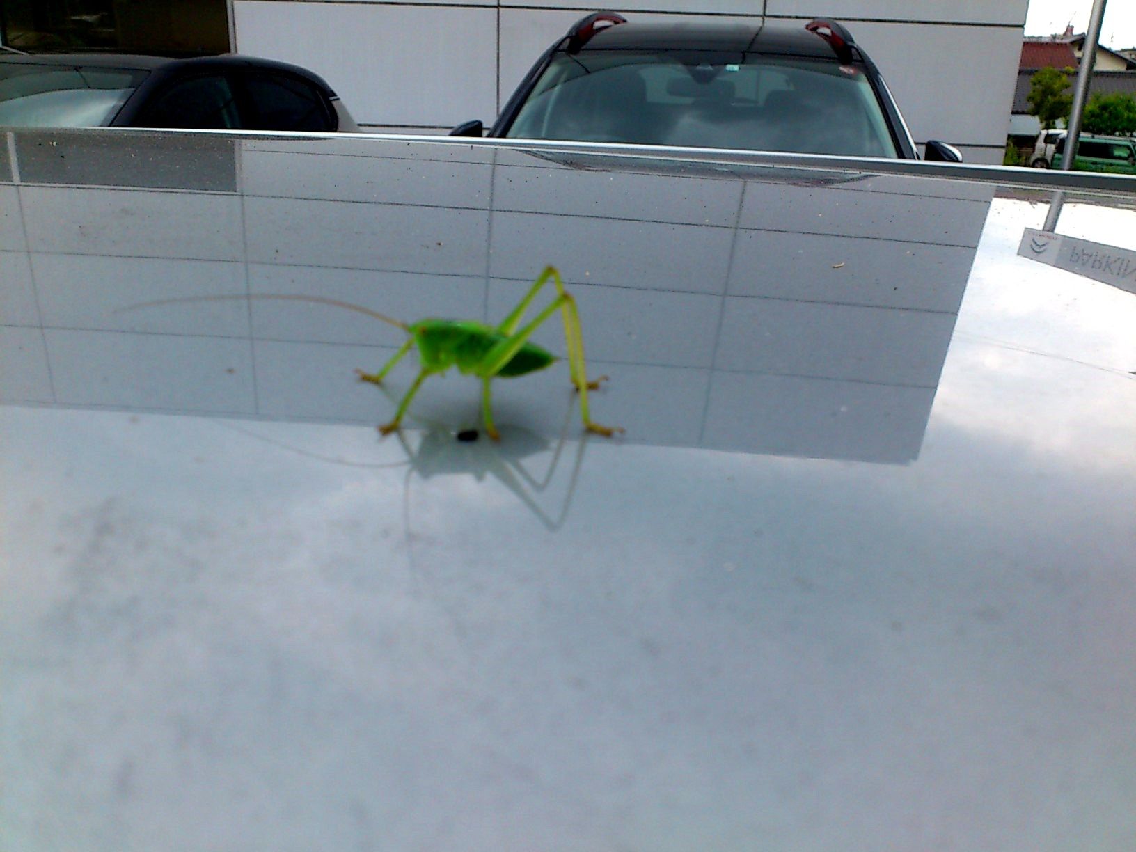 シトロエン名古屋天白のすぐ裏には「相生山緑地」という大自然があるので、いろんな動物や昆虫が出没します。今日は代車を取りに駐車場へ行ったら、バッタ?がルーフパネルに座っていました。ショールームの駐車場まで回送しても、座ったまま・・・さぁこれからは、いろんなのが出る季節です!15年ぐらい前は「たぬき」が出ましたが、最近は見かけません。どこへ行ってしまったのだろう?