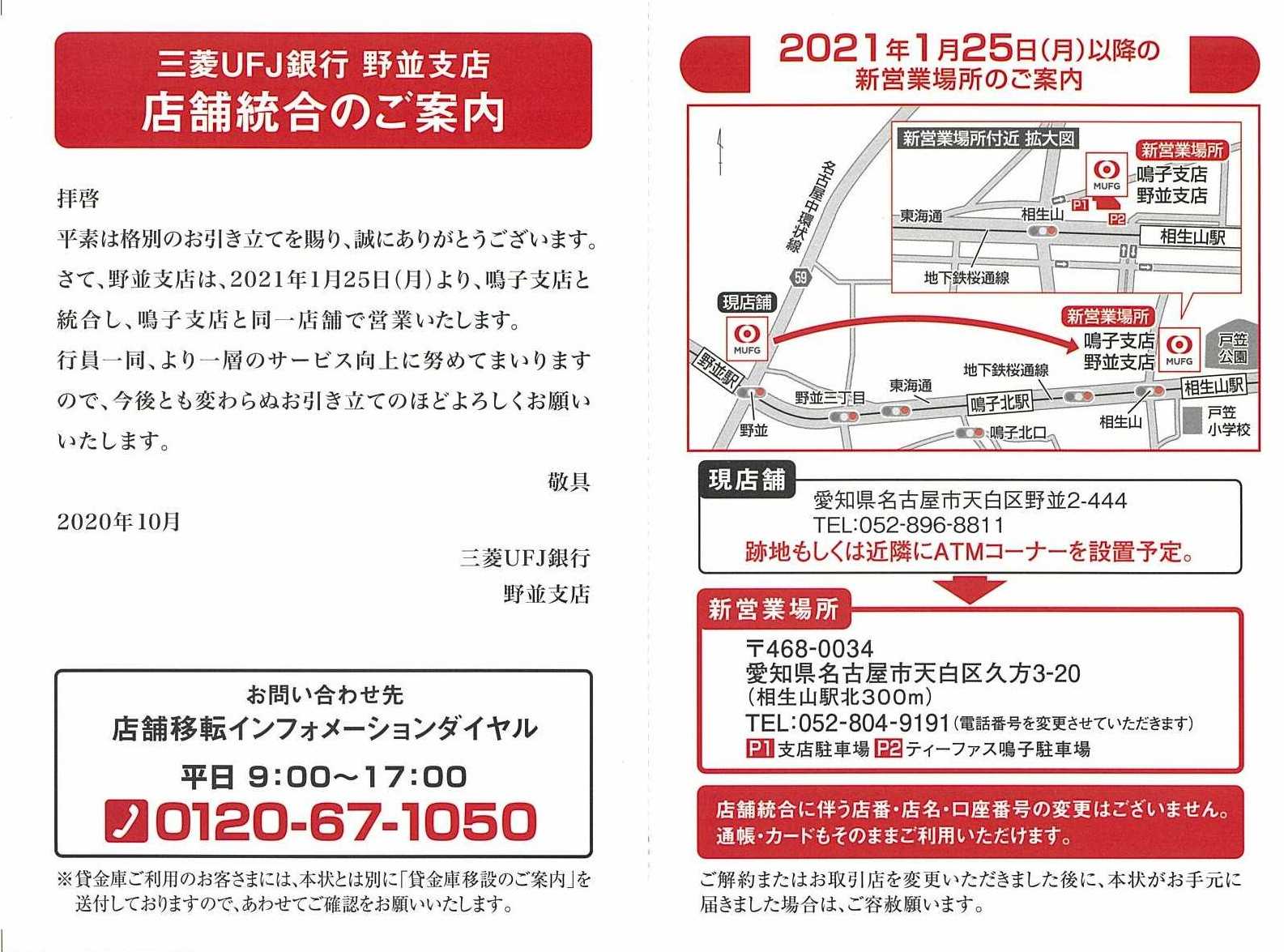 昔の東海銀行、今は三菱UFJ銀行は無くそうとした出張所を支店に格上げして、ついには鳴子支店と野並支店を同一店舗内に持ってくるとは、大胆なやり方です。ということは、野並支店は手放すんだ。近くの方が残ってくれて助かりました。この鳴子支店は昔はメーンで使ってましたが、急に出張所のなるので野並に移ってくださいという成り行きで野並支店に移ったのですがもういちど支店に戻り、こんどは野並支店も引き込むとは不思議なもんです。今言えることは、無くならないで良かったとです。いまや担当者もいなくて、普通預金と当座預金があるだけですが慣れてるので借り入れもないけどメーンバンクみたいに使ってます。こちらがそう思ってるだけで、銀行は何とも思ってないでしょうが。