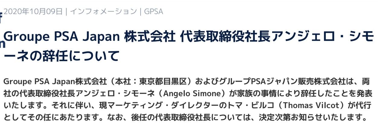 昔でいう、プジョーシトロエンジャポンのトップが辞任しました。よっぽど理由があったと思いますが、今後の日本での販売方法が今のままということだけは、ないでしょう!
