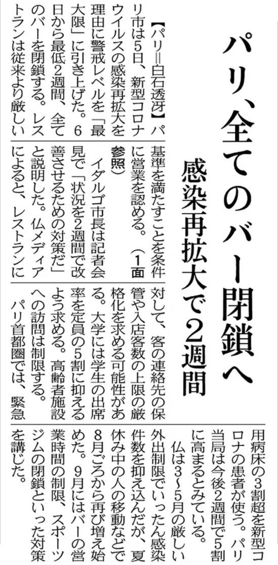 このニュースを見て・・・部品が遅れる気がしてきました。外出禁止令だから、しかたがないよね。フランス政府は新型コロナウイルスの感染が再び広がっていることを受けておよそ3か月ぶりに公衆衛生上の非常事態を宣言し、今月17日から首都パリなどで夜間の外出が禁止されることになりました。ヨーロッパでは感染拡大に歯止めをかけようと厳しい規制を導入する動きが相次いでいます。対物事故で入庫しているクルマの外装部品でバックオーダーになってる物がありますが、異常に到着日が遅いのですが原因はこれですね。保険会社の担当者様・・あんまり「わぁーわぁー」言わないでね!