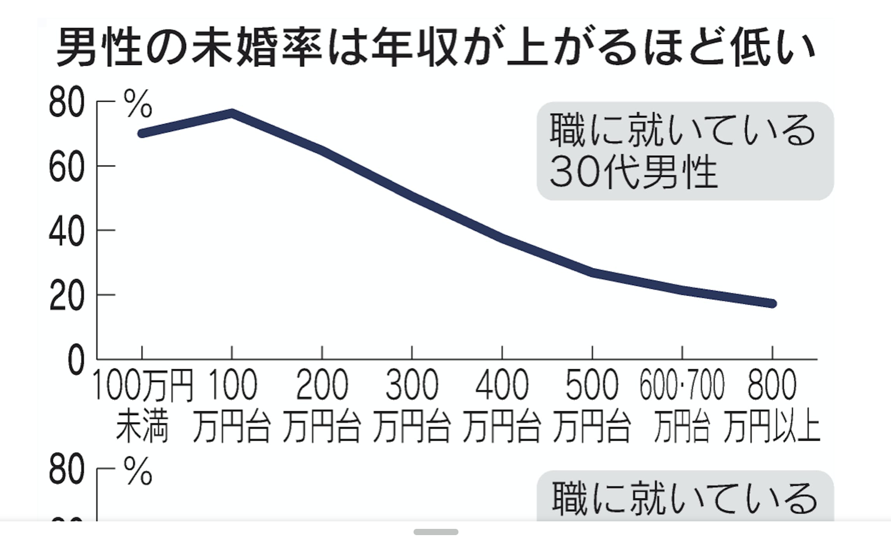 この表だと年収が高い30代は結婚している確立が高いですがそうじゃない人物が近く(家族)にいます。のでちょっと違う気もしますが全体での数字だとこうなるんでしょうね。