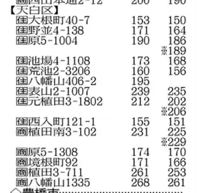 天白区境根町、こんなもんですね。昔住んでた場所からするとだんだんと地価が低いとこへ移っているみたいです。東区→天白区(表山)→瑞穂区→天白区(境根町)いや間違いなくそうです。次は順番に戻って行きたいです。でも職場が天白なので近くて便利ですけどね。番外編だけど三重県津市の地価はかなり低いですね。こんどはそこに移ってたりして??