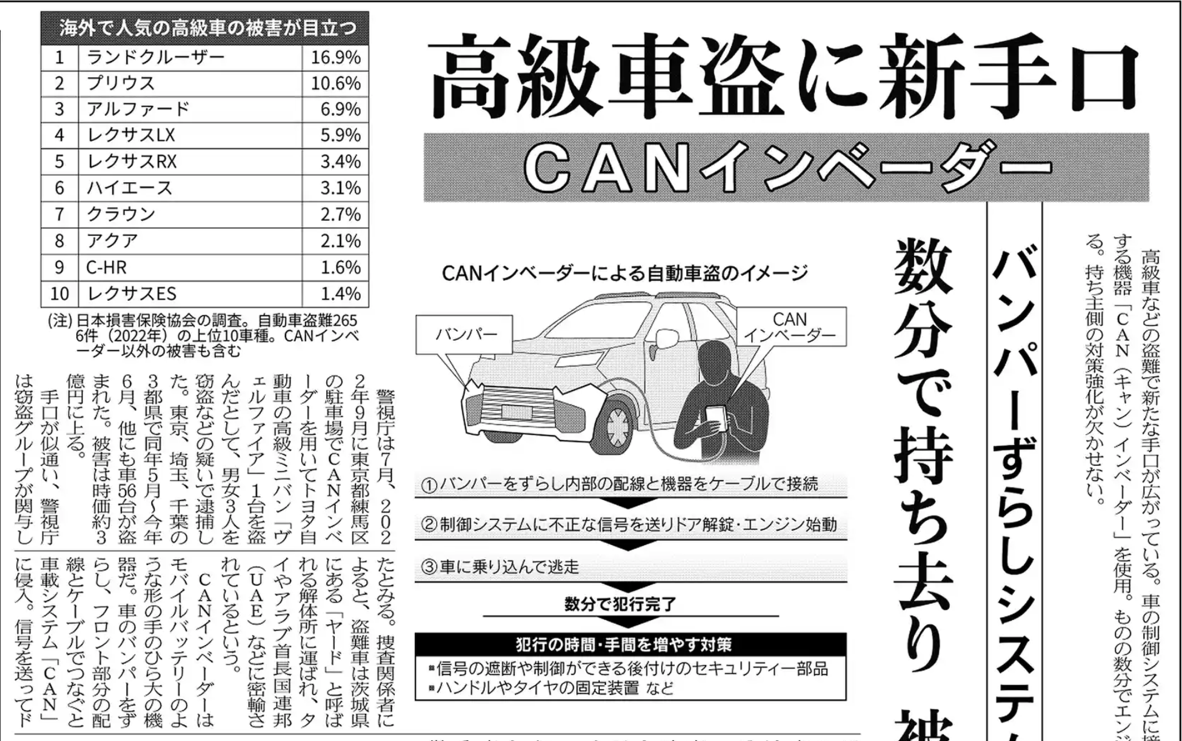 日本のトヨタ・・いや、日本はトヨタなのか?大人気ですね。盗む方も自動車工学の知識があればやれちゃうでしょうね。原始的な盗難防止器具で予防がいいのでは?初めてヨーロッパに行ったとき(33年前)に入った高速道路のサービスエリアで盗難防止器具をいろいろ売ってたのを想い出しました。この問題は解決することなく続くでしょうね。