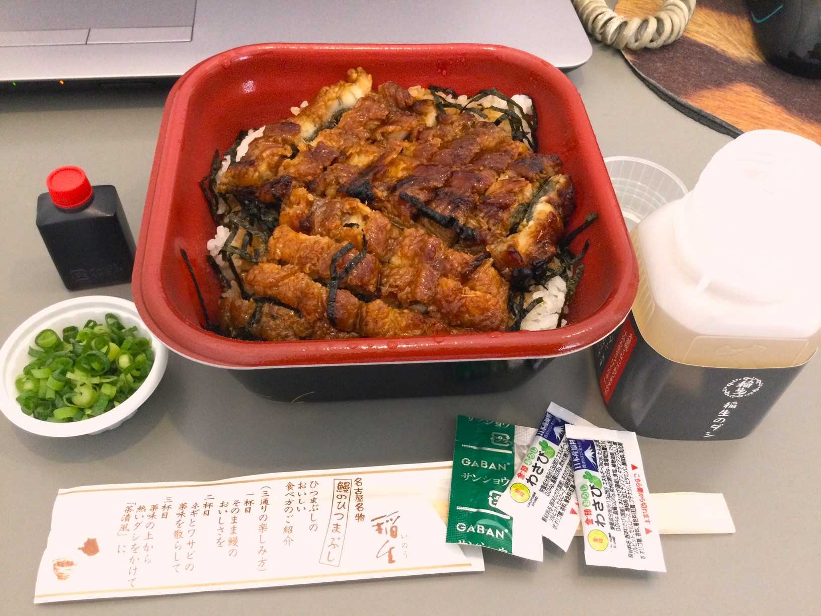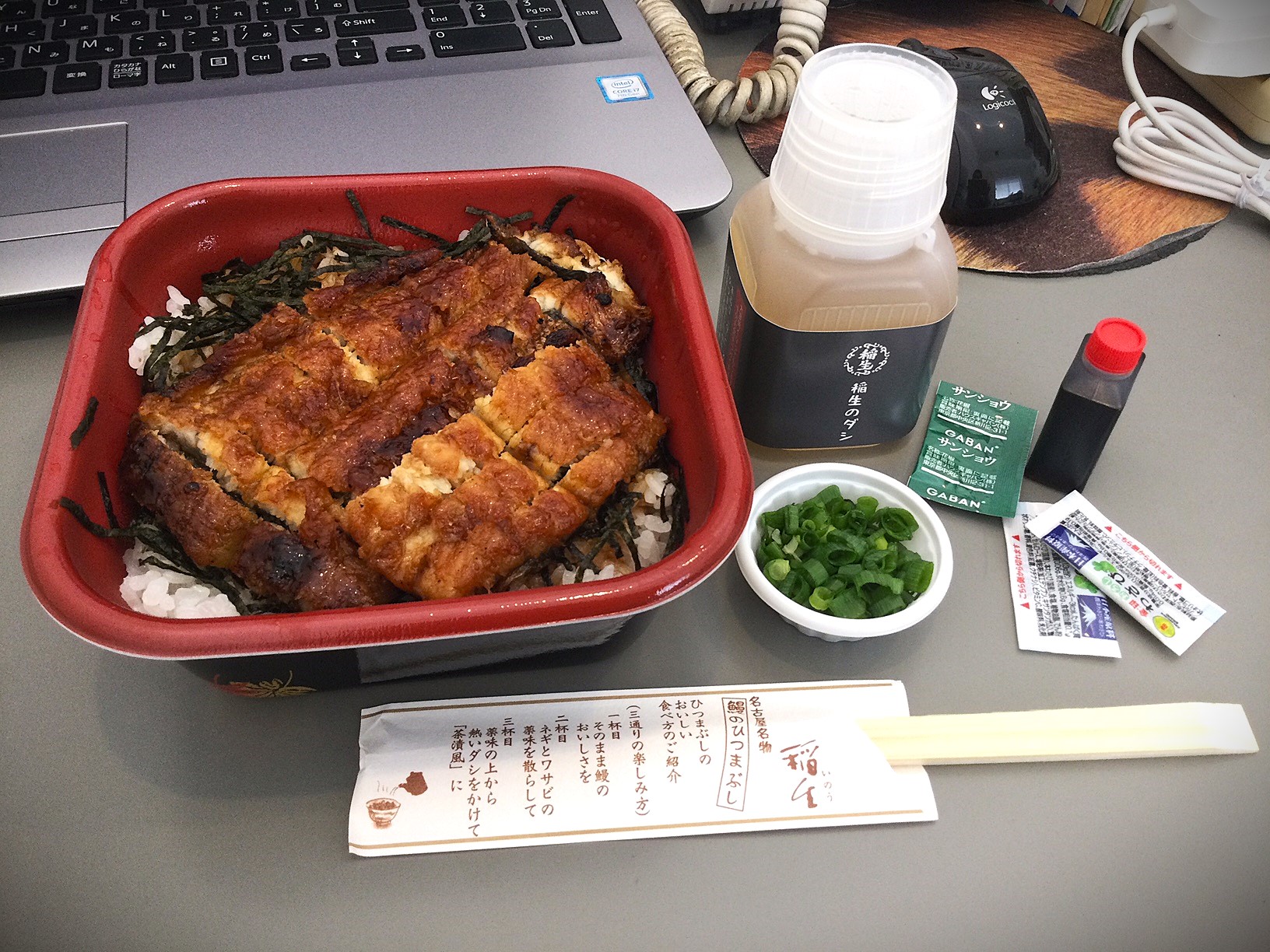 もうすぐ1時になろうかという時に電話があり今から鰻を届けるということなので、食べに行かずに待ちました。ひつまぶし!でした。まだ、あたたかい持ち帰り弁当だったのですぐに食べることにしました。連休の浜松(特に浜名湖のまわり)旅行中は鰻のお店がすごくたくさんあり、寄りたかったけど夕食も朝食も食べすぎぐらいだったので機会を逃がしてました。そんな時の鰻は・・・とても良いです。
