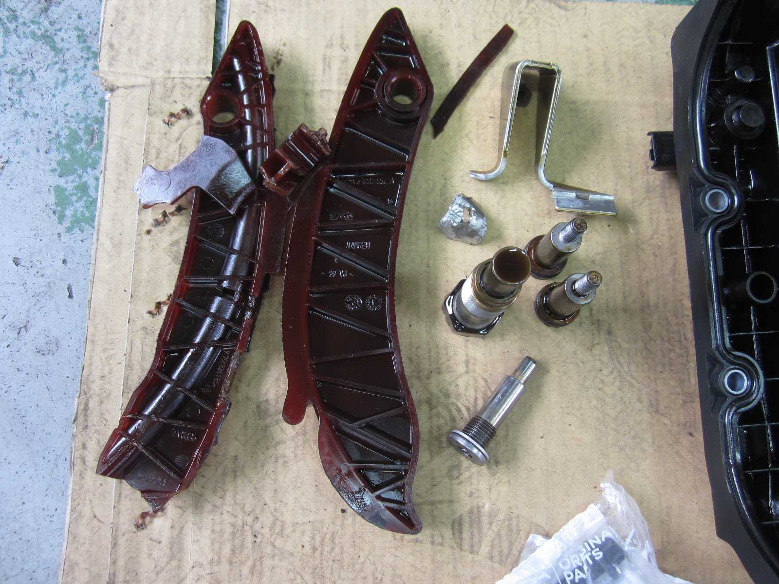今日は車検や点検の仕事をせずにタイミングチェーン交換に専念しようと決めた矢先に問題が発生です。チェーンガイドが割れてエンジン内部に落ちてますね。これで予定通りの時間に終了することはなくなりました。よく、いままでエンジン始動していたもんです。もう少しでバラバラになる直前でしたね。作業しているメカニック、気を取り直して問題のエンジンに向かっていました。