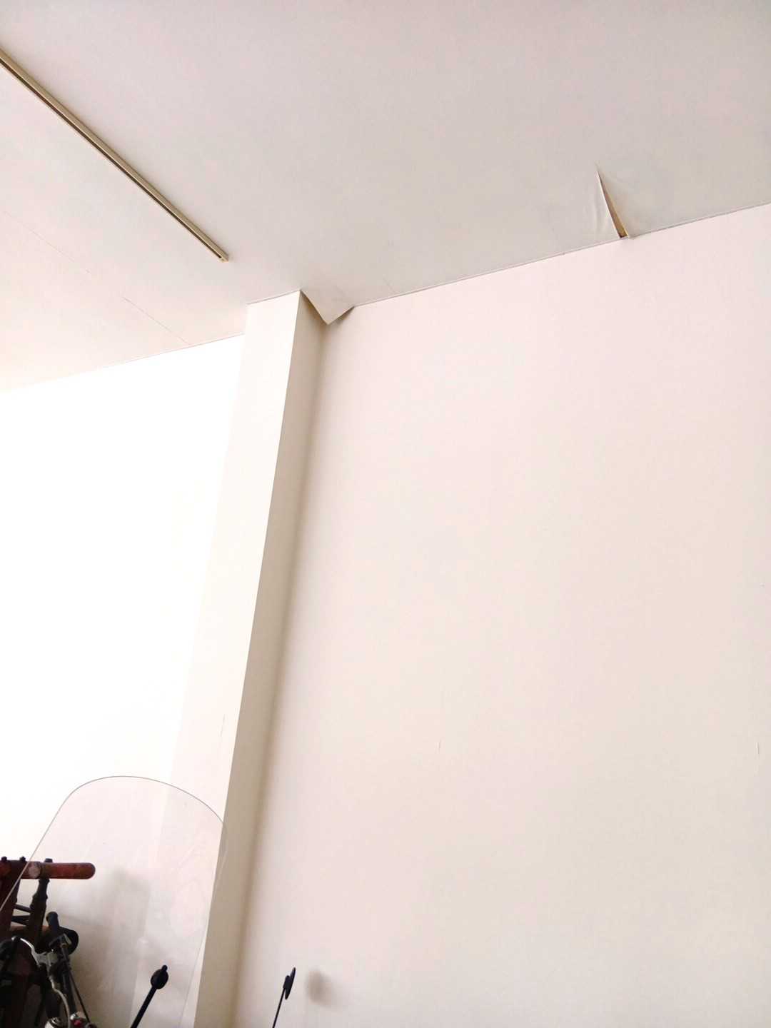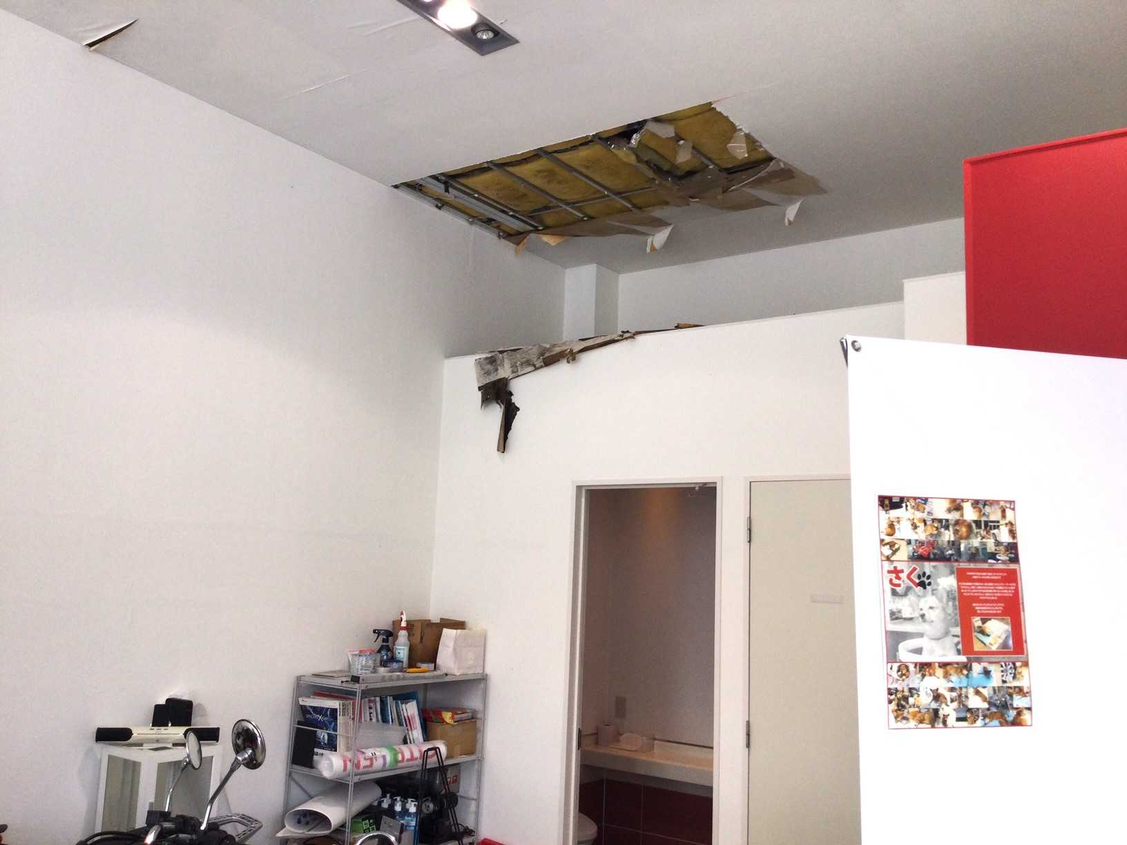 昨日の集中豪雨(大雨警報がでたので、きっとそうだったろう)でショールームの排水が追い付かずにあふれかえり、豪快に流れ込み天井の一部が崩れ去りました。誰もいない時だったので、どんな音がしたのかはわかりませんが、大きな音だったでしょう。落ちてきた部分の修理とクロスの張り替えになります。いままでこんなことはなかったので、よほど短時間に降り続けたのですね。