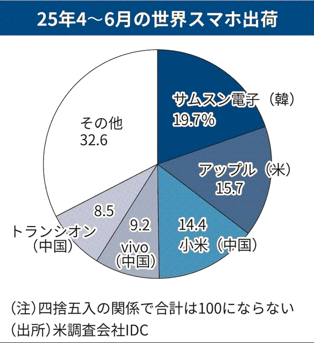 サムスンがトップですが、中国の3つを足すとすごい割合になります。でも使ってみたいのはサムスンです。長持ちしないかもしれませんが。二つ折りになるタイプが欲しいです。性能も大事ですが、なるべく小型の方がいいので。